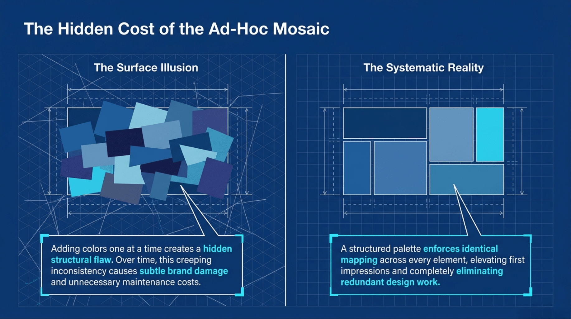 Second, updates become time-consuming. If your brand color changes, there is no central place to make that update. Instead, someone has to find and replace each color manually across every page. By establishing a professional brand guideline color palette within your website structure, you turn a multi-hour task into a quick, controlled adjustment. This efficiency is a core part of broader business automation services that save small business owners significant time and resources.