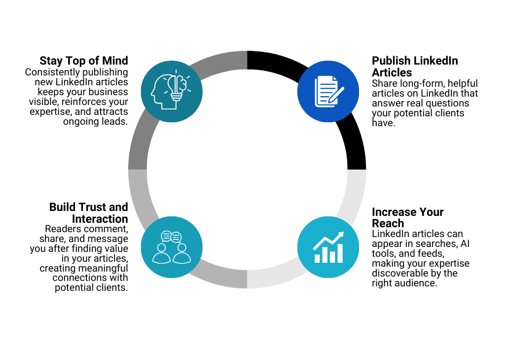 Imagine a potential customer is looking for a local plumber, designer, marketing expert, etc. Instead of finding your business on Google, they ask an AI tool like ChatGPT, “Who offers reliable [service] near me?” If you haven’t shared helpful, clear information online, that customer could end up contacting a competitor they’ve never heard of. The good news? Writing articles on LinkedIn makes it easy for the right people to discover your expertise—and trust that you can solve their problem.
