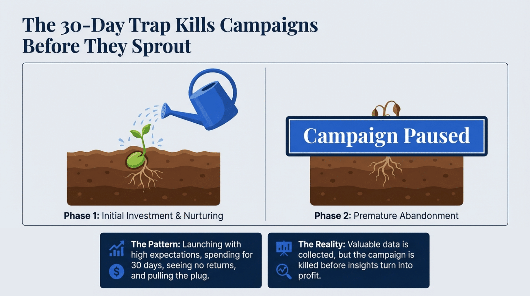 Most Google Ads campaigns fail before they have a chance to succeed. Setting up an effective advertising campaign requires patience, the right expectations, and a strategy that goes beyond the first month. We see this pattern repeatedly with Kansas small businesses. A business owner launches an advertisement with high expectations—only to pull the plug after 30 days of spending without significant results. Valuable data is collected, but the campaign ends before it can turn those insights into profit.