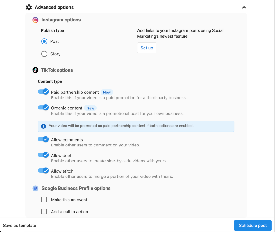 TikTok has introduced new Advanced Options that let users specify whether a post is Paid Partnership Content or Organic Content—and this capability is now available in Social Marketing. These options help businesses stay compliant with promotional requirements and provide clearer transparency to their audiences.