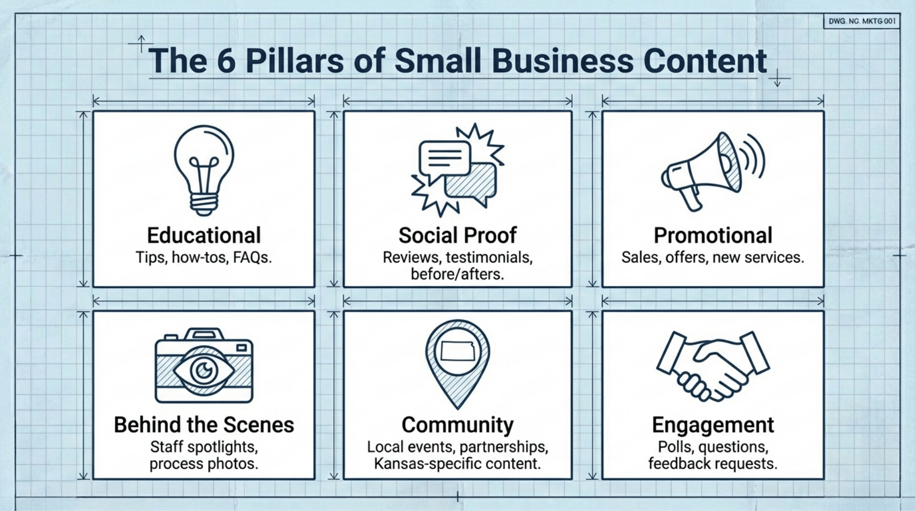 - Community: Local events, partnerships with other businesses, Kansas-specific content
