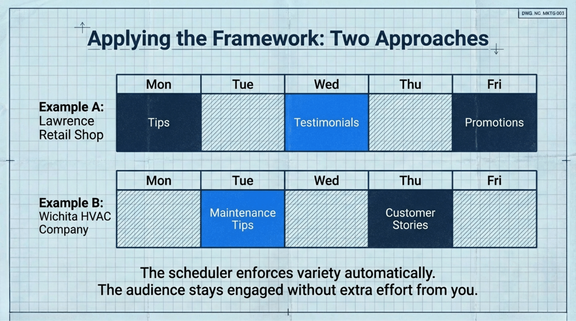 A Lawrence retail shop might schedule Monday for tips, Wednesday for testimonials, and Friday for promotions. An HVAC company in Wichita might use a social media scheduler to post maintenance tips on Tuesdays and customer stories on Thursdays.